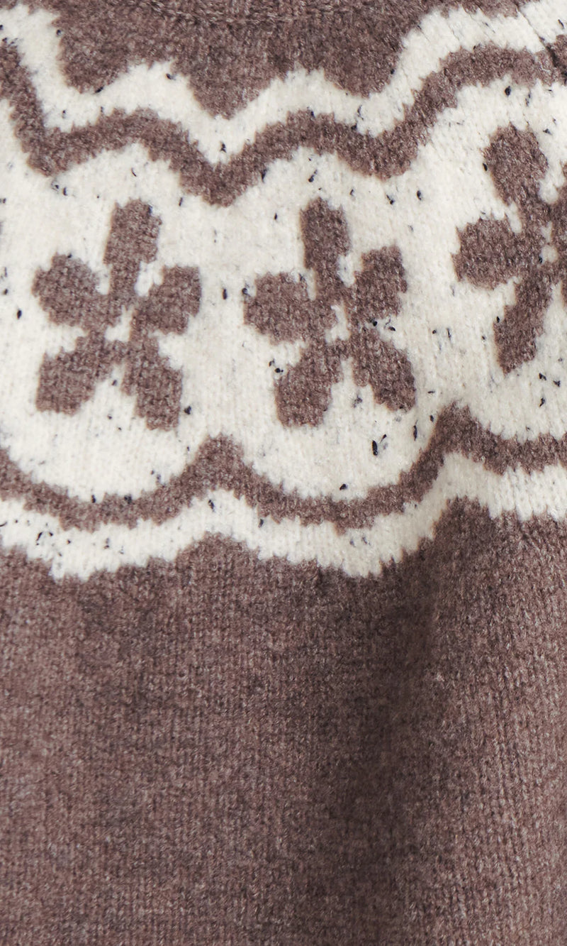Cozy up with Saylor's Blanche sweater. Sweater weather is quickly approaching and Saylor has got you covered with their daisy sweater. The acrylic blend sweater has a turtle neck, and the neck yoke is patterned with daisy flowers. Pair the brown sweater with your favorite jeans for a comfy fall look.