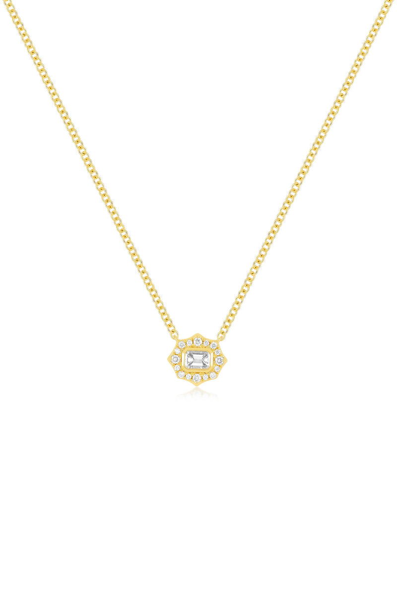 This dainty chain necklace from EF Collection features a pendant with a dazzling emerald-cut diamond framed with pavé stones. The pendant is crafted of 14-karat gold and has a spring-ring closure. The total diamond weight is 0.22ct with G–H color and SI1–SI2 clarity.